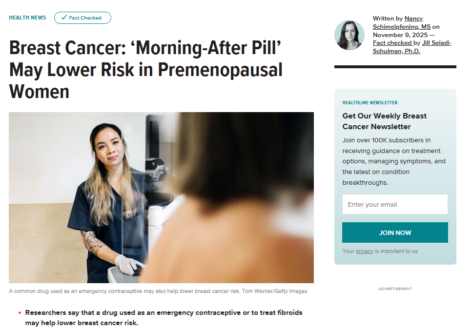 Dünyanın en büyük sağlık sitesi ve endüstri lideri Healthline’da, Prof. Dr. Metin Çakmakçı (Acıbadem Health Group - Meme Cerrahisi) habere uzman görüşüyle dahil edilerek Acıbadem’in uluslararası tıbbi otorite konumu güçlendirildi. 9 Kasım 2025 tarihli Healthline haberinde, “morning-after pill” (ulipristal asetat) kullanımının premenopozal kadınlarda meme kanseri riskine etkisini inceleyen Nature çalışması aktarılırken, Prof. Dr. Çakmakçı; yüksek riskli gruplarda kemoprevensiyon seçenekleri (tamoksifen, raloksifen, aromataz inhibitörleri), koruyucu cerrahi ve kişiye özel tarama planları konusunda yol gösterici değerlendirmeler paylaştı. Bu konumlandırma ile: